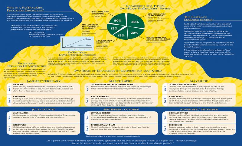 FasTracKids focuses on the process of learning (how) as well as the content of the lessons (what). Each of the two hour lessons explains the how and what of the 12 different subjects, prompting children to ask Why? FasTracKids includes fun, attention-grabbing topics such as: Astronomy, Biology, Communications, Creative Literature, Creativity, Earth Science, Economics, Goals and Life Lessons, Mathematics, Natural Science, Speech, Drama and Art, and Technology. Children have 16 hours of instruction for each subject area. Parent conferences are conducted throughout the program, offering opportunities for in-person discussions about a child’s progress.